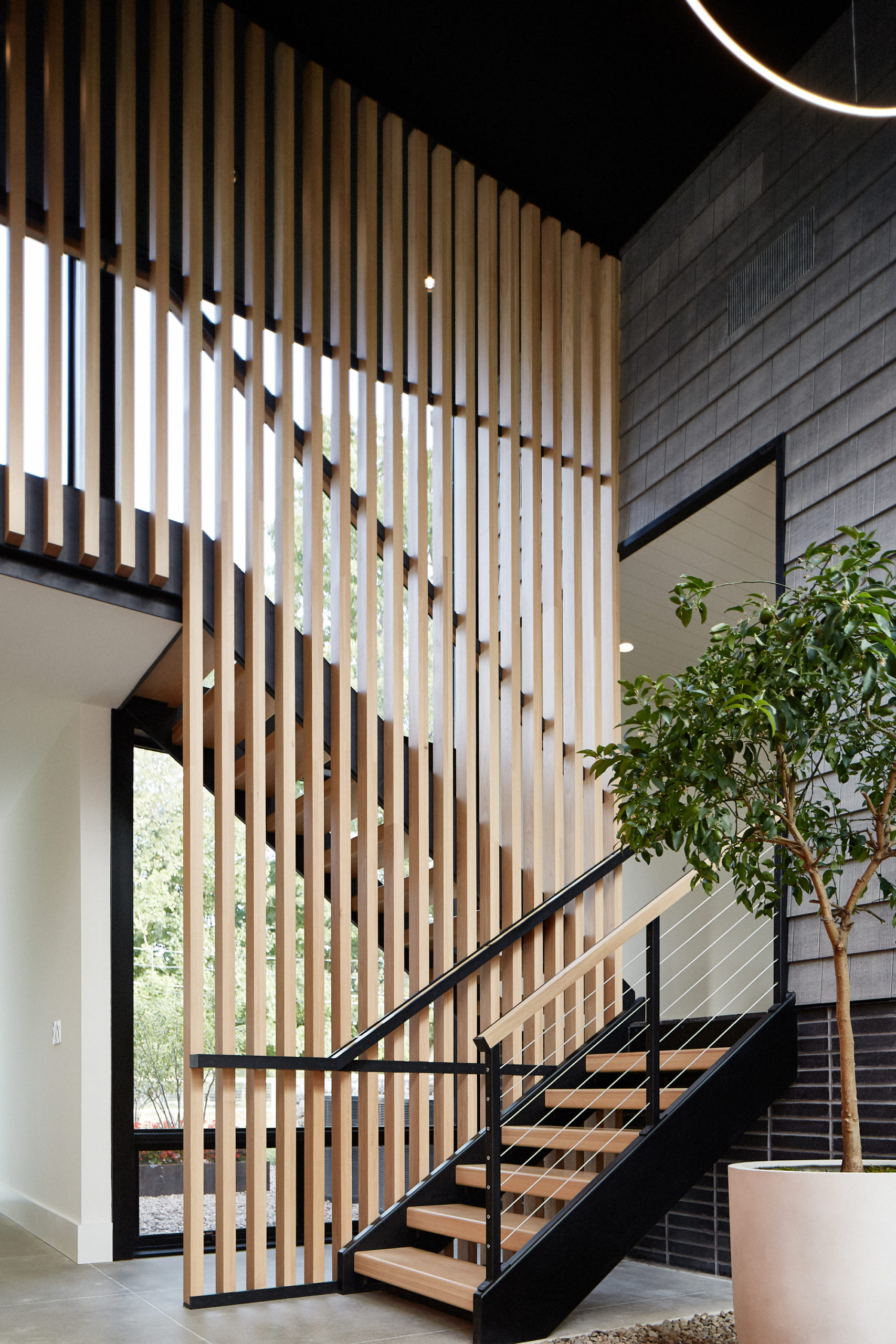 Entertaining or relaxing in the living room which has a sloped ceiling and white oak slatted gable wall, as well as the kitchen, which boasts Henry Built kitchen cabinetry, whose function and design are predicated on simplicity, consistency and functionality. Separating the “boxes” is a modern glass prism containing a floating stair with slatted wood screen wall. The leads to the Northern box containing the private bedrooms or a continued ascent leads to the third floor revealing a shared studio space.